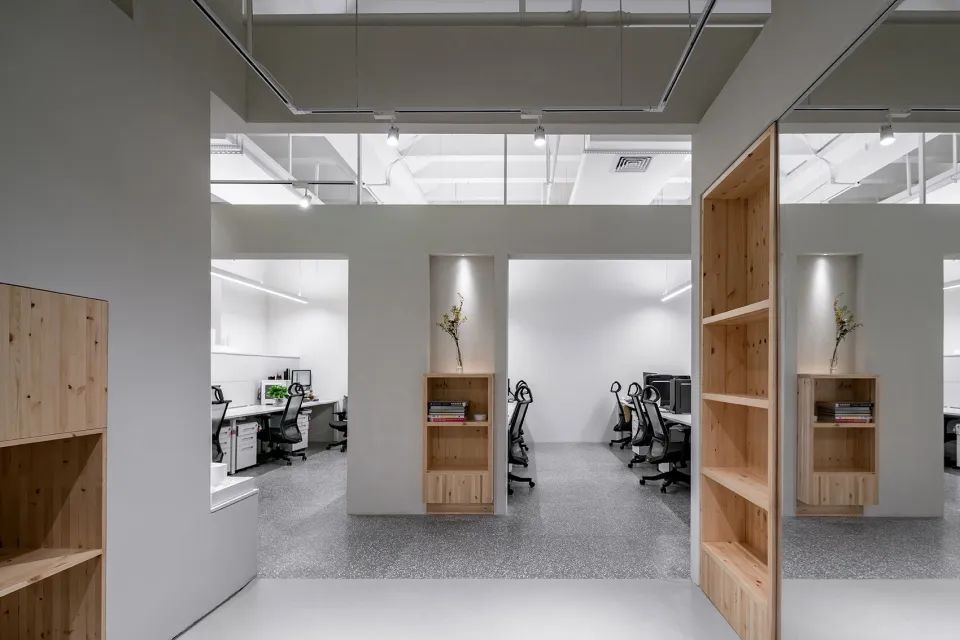 這是一個(gè)“解構”的新型辦公室。與傳統的辦公場(chǎng)所不一樣,這里強調的是開(kāi)放中又有私密,互動(dòng)和獨立相容。從整體來(lái)看,這是一個(gè)風(fēng)格較為硬朗粗獷的空間,我們融入了“微工業(yè)風(fēng)”的元素,但墻體一白色覆蓋,則彰顯出柔和與想象空間。